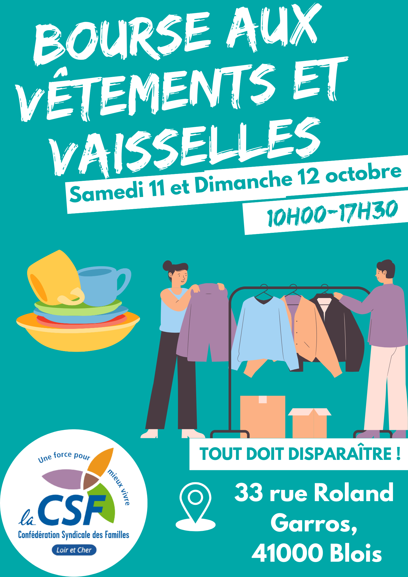 La Confédération Syndicale des Familles du Loir et Cher planifie deux jours de bourse aux vêtements qui aura lieu le 11 octobre 2025 et le 12 octobre 2025 de 10h00 à 17h30 au 33 rue Roland Garros 41000 Blois.